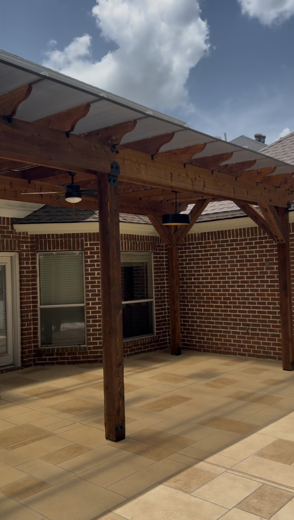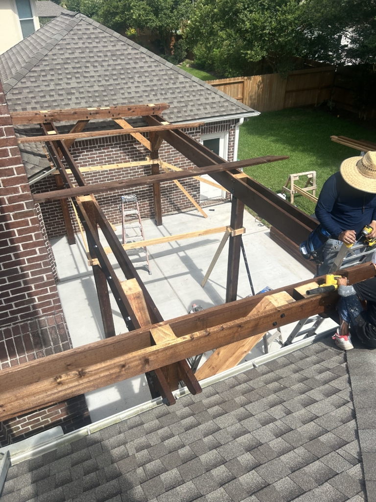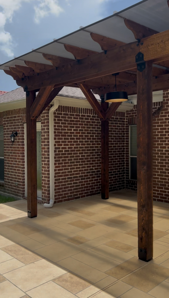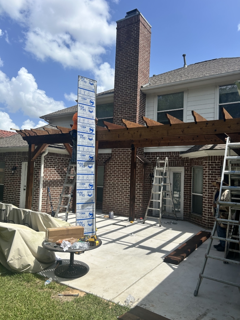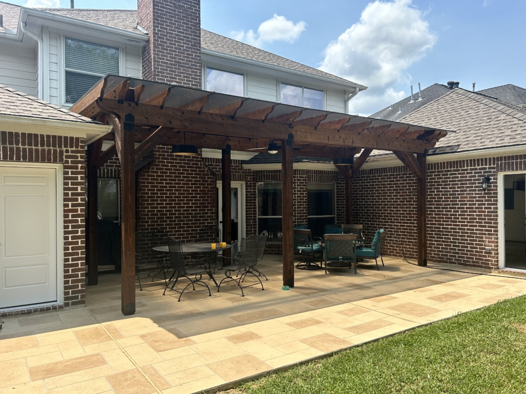 IG Remodeling recently completed a Custom Cedar Pergola with Hercules Poly Roof System in the Memorial Area, designed as a detached structure for maximum flexibility. The Hercules roof panels are wind-rated up to 125 MPH and filter natural light while blocking UV rays and rain. Attached securely to the home’s siding wall and fireplace with waterproof metal flashing, this system combines strength and transparency for year-round use.